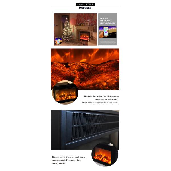 | Standard configuration: | Electric fireplace thickened cold rolled paneling/ LED light source thickened toughened glass/fiber pseudo wood /optical reflective curtain |